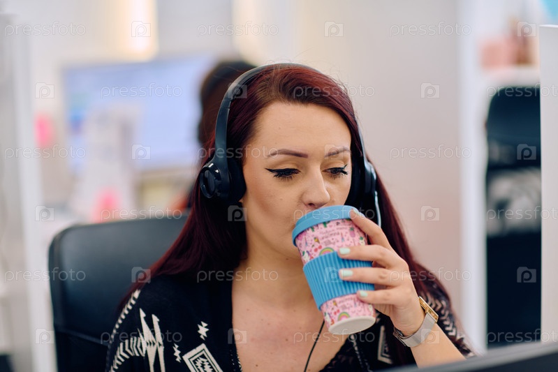 Сотрудник колл-центра заряжается энергией за чашкой кофе во время работы