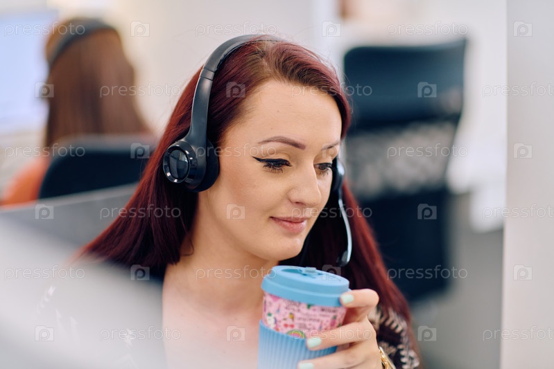 Сотрудник колл-центра заряжается энергией за чашкой кофе во время работы