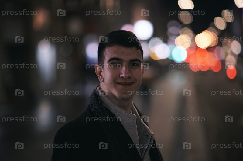 Улыбающийся мужчина с Востока идет по улице возле современного офисного здания,
