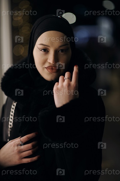 Мусульманка идет по городской улице холодной зимней ночью в хиджабе