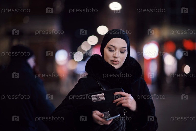 Мусульманка идет по городской улице холодной зимней ночью в хиджабе