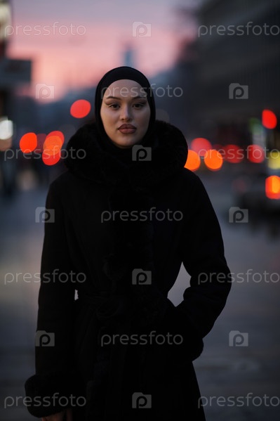 Мусульманка идет по городской улице холодной зимней ночью в хиджабе