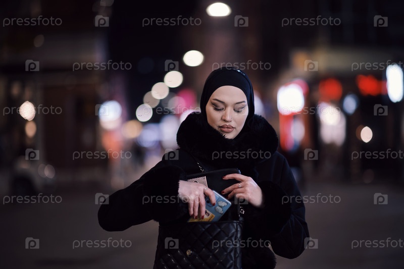 Мусульманка идет по городской улице холодной зимней ночью в хиджабе