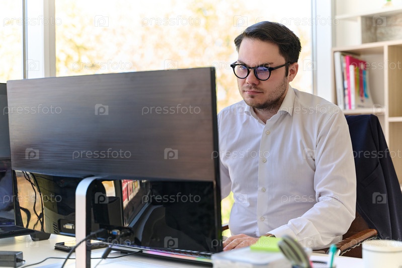 Директор компании в современном офисе, ориентированный на работу за компьютером