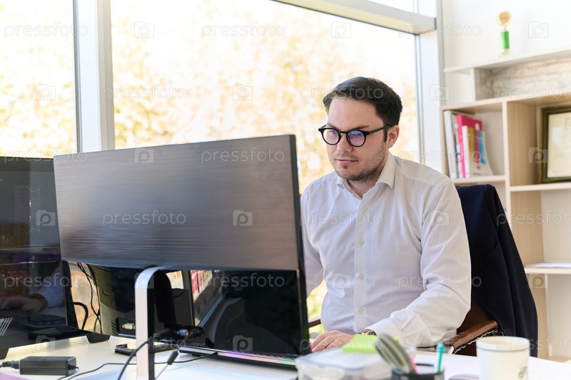 Директор компании в современном офисе, ориентированный на работу за компьютером