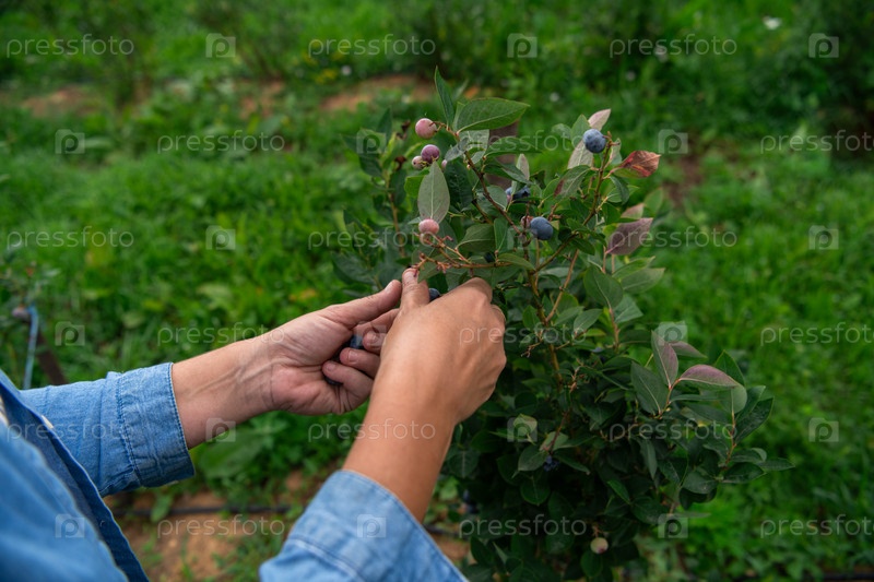 Крупный план женской руки, осторожно собирающей свежую чернику в залитом солнцем саду