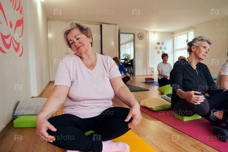 Группа пожилых женщин занимается различными упражнениями йоги, включая растяжку шеи, спины и ног, под руководством тренера в залитом солнцем месте, способствуя благополучию и гармонии