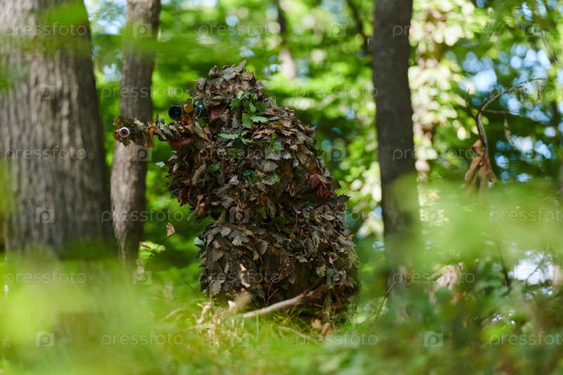 Высококвалифицированный элитный снайпер, замаскированный в густом лесу, скрытно маневрирует по опасной лесной местности, выполняя скрытное и точное задание