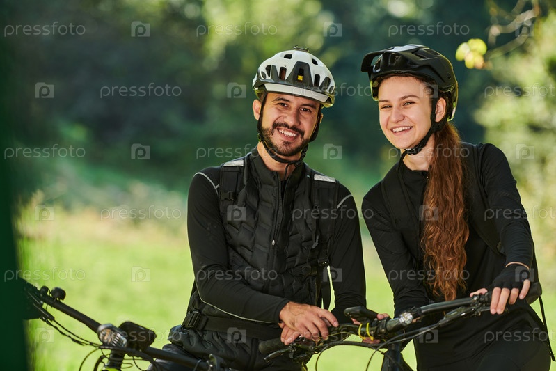 Счастливая пара, одетая в профессиональную велосипедную экипировку, наслаждается романтической велопрогулкой по парку, окруженному современными природными достопримечательностями, излучая любовь и счастье
