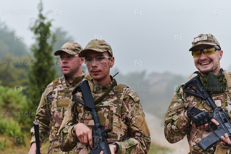 Дисциплинированное и специализированное военное подразделение, облаченное в камуфляж, осуществляющее стратегическое патрулирование и сохраняющее контроль в обстановке с высокими ставками, демонстрирующее свою точность, сплоченность и готовность к специаль