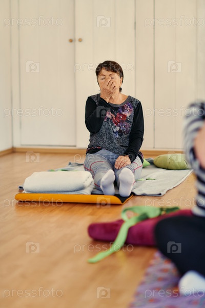 Пожилая женщина практикует успокаивающие традиционные упражнения с мягким жестом лба