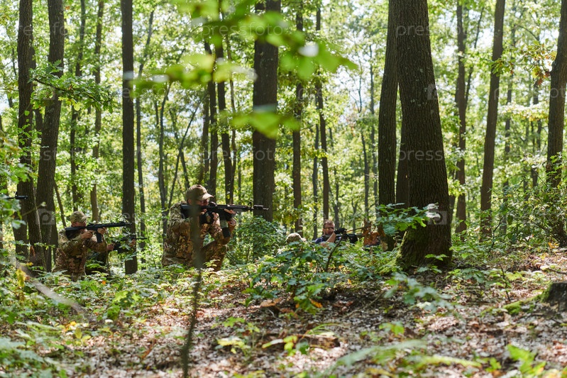 Специализированное военное антитеррористическое подразделение проводит секретную операцию в густом, опасном лесу, демонстрируя точность, дисциплину и стратегическую готовность