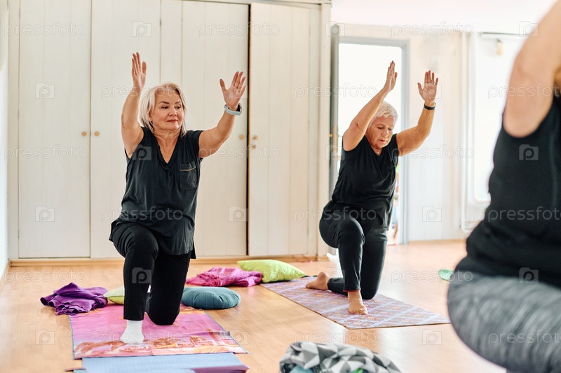 Группа пожилых женщин занимается различными упражнениями йоги, включая растяжку шеи, спины и ног, под руководством тренера в залитом солнцем месте, способствуя благополучию и гармонии