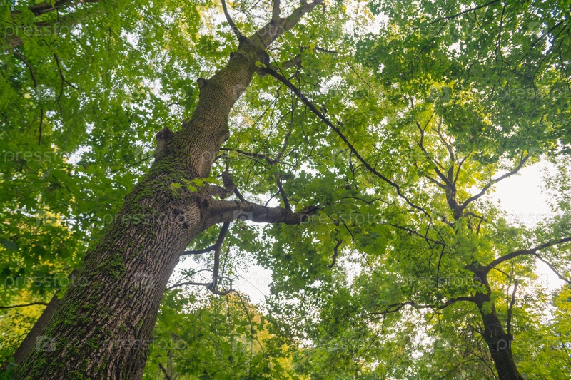 Большие деревья в лесу с пышной зеленой листвой, вид снизу