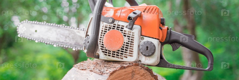 Бензопила лежит на распиленных бревнах среди зелени леса, выборочный фокус размытый фон