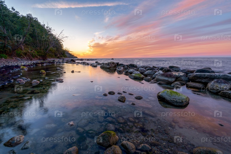 Скалистый берег моря, на заднем плане яркий оранжевый закат