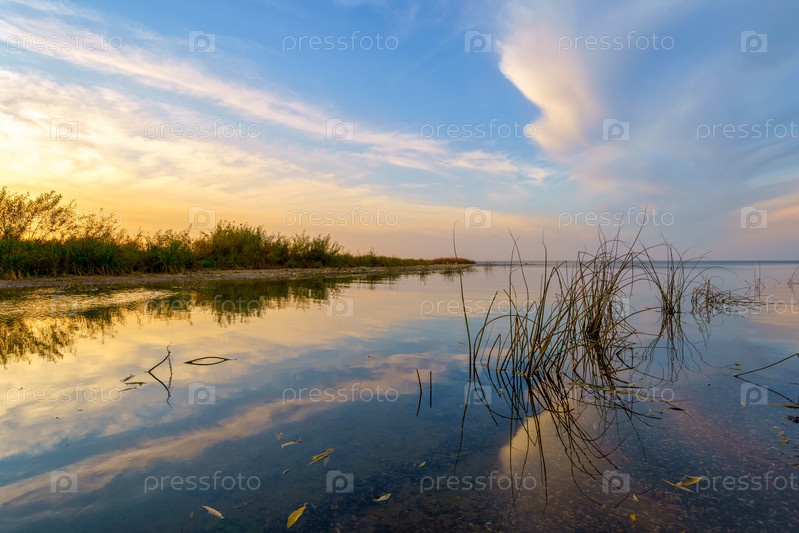 Оранжевый закат на тихом озере, закат отражается в спокойной воде