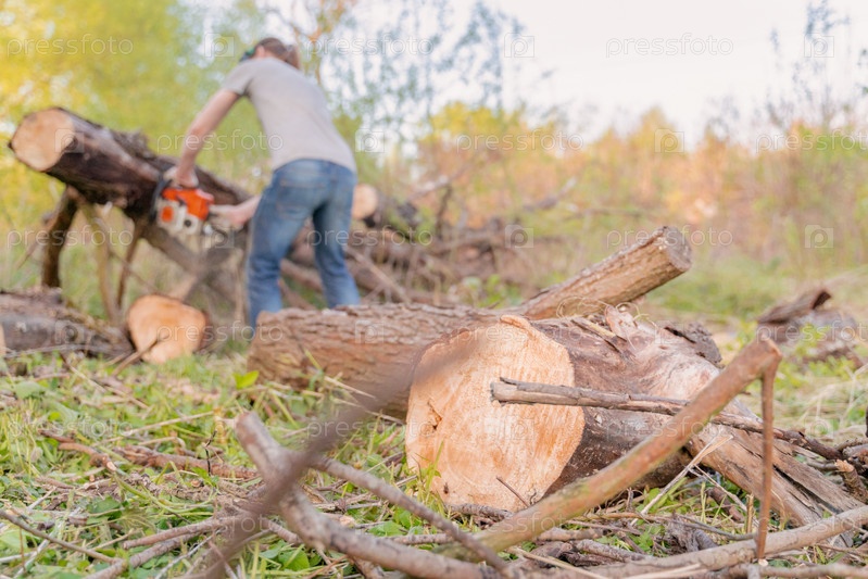 Фермер пилит дерево бензопилой, выборочный фокус, фокус на переднем плане, размытый фон
