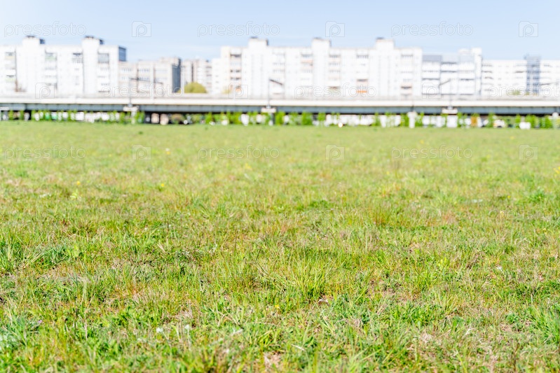 Поле с зеленой травой, городской пейзаж на заднем плане, фокус на переднем плане