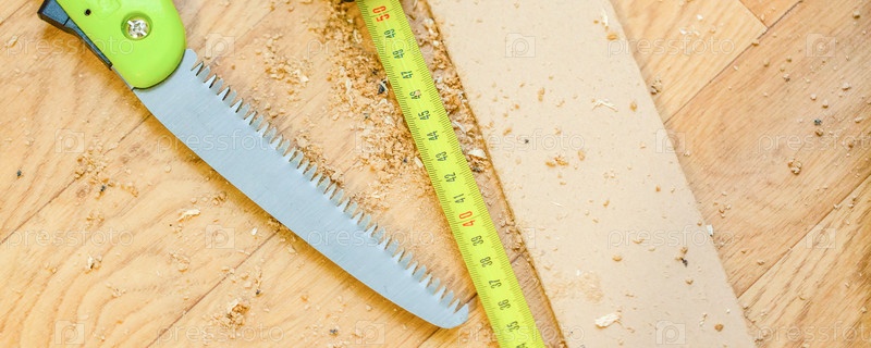 Желтая измерительная лента и пила среди опилок, крупный план, размытый фон