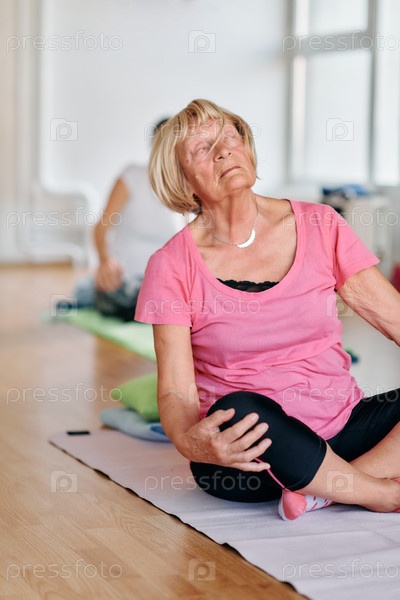 Женщины старшего возраста занимаются оздоровлением: йогой и растяжкой в залитом солнцем пространстве