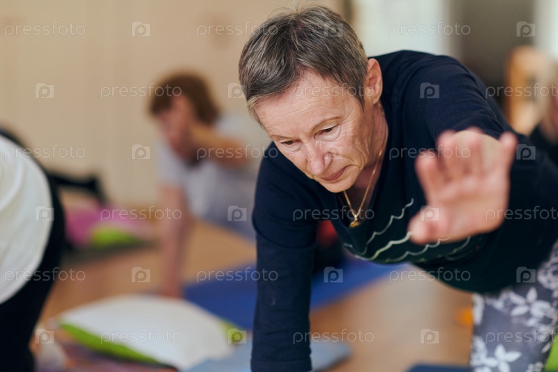 Группа пожилых женщин занимается различными упражнениями йоги, включая растяжку шеи, спины и ног, под руководством тренера в залитом солнцем месте, способствуя благополучию и гармонии