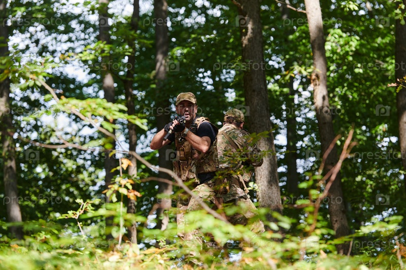 Специализированное военное антитеррористическое подразделение проводит секретную операцию в густом, опасном лесу, демонстрируя точность, дисциплину и стратегическую готовность