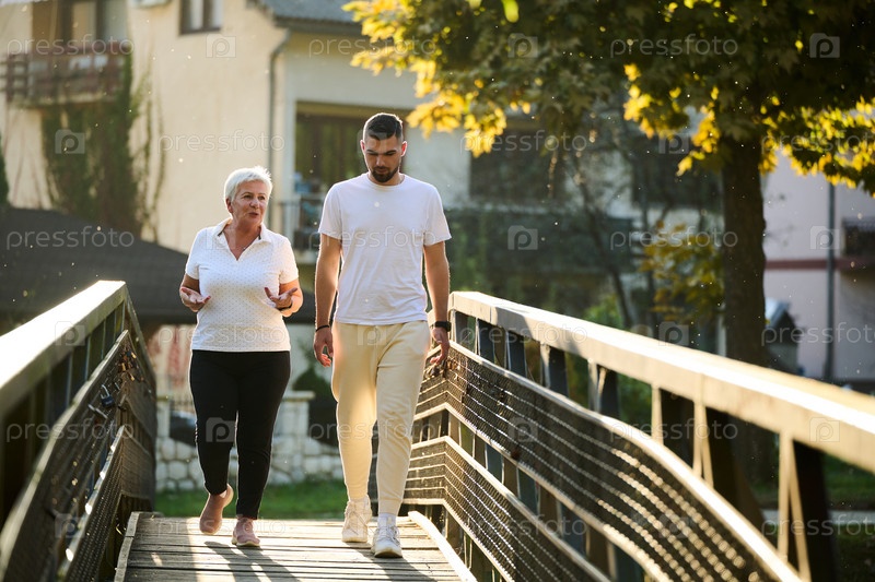 Красивый мужчина и пожилая женщина спокойно прогуливаются на природе, пересекая красивый мост на фоне потрясающего заката, олицетворяя концепцию здоровой и яркой жизни между поколениями