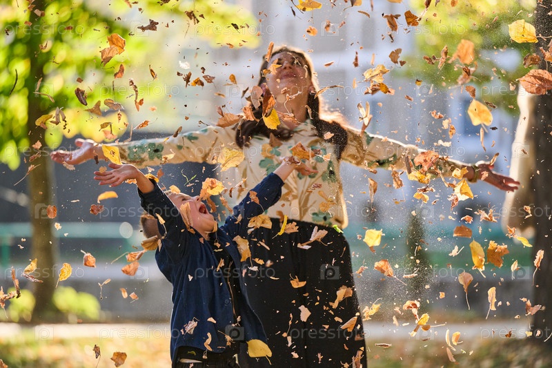 Современная женщина с радостью играет со своим сыном в парке, подбрасывая листья в прекрасный осенний день, запечатлевая суть семейной жизни и теплоту отношений матери и сына в разгар осени