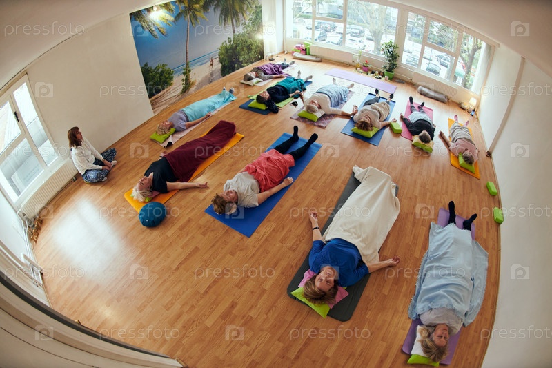 Группа пожилых женщин занимается различными упражнениями йоги, включая растяжку шеи, спины и ног, под руководством тренера в залитом солнцем месте, способствуя благополучию и гармонии