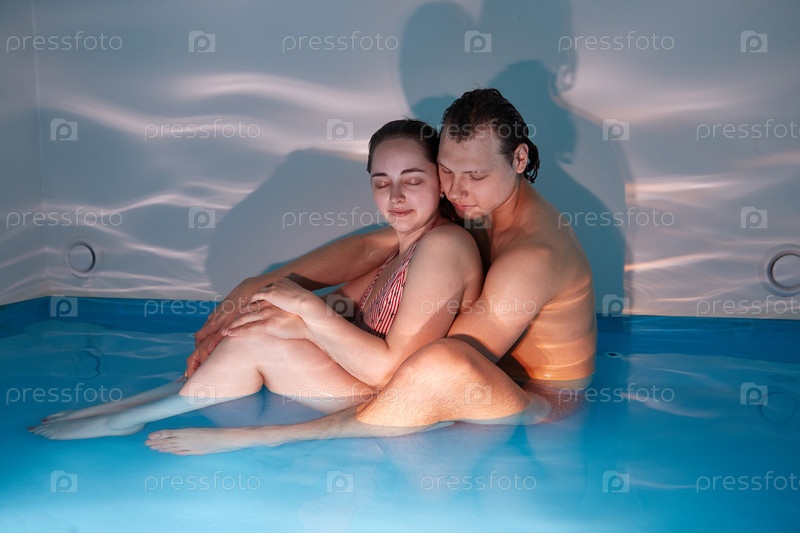 Влюбленная пара сидит и обнимается в лечебном оздоровительном бассейне с соленой водой
