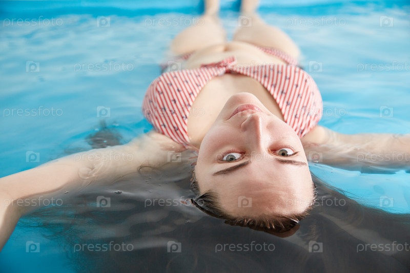 Женщина смотрит в камеру, лежа в воде соленого бассейна. Спа-процедуры