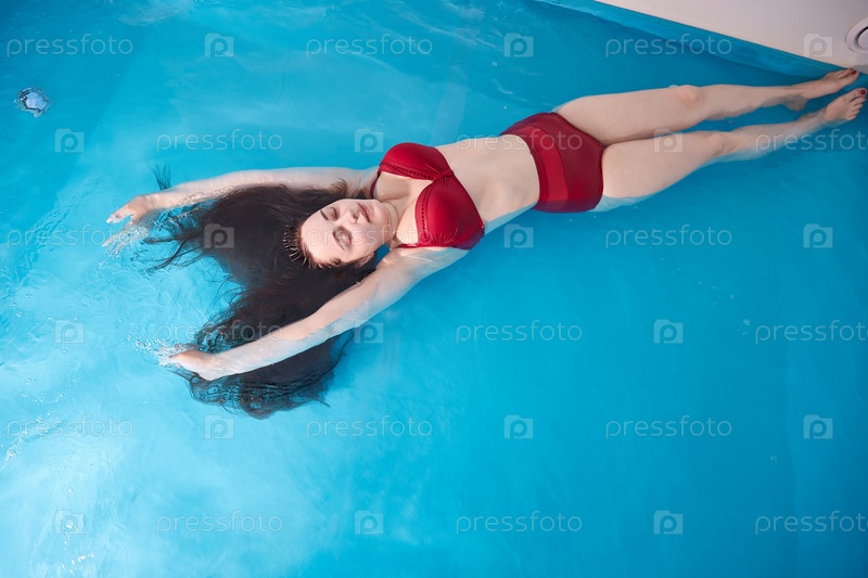 Молодая женщина наслаждается отдыхом в бассейне или ванне с соленой водой. Брюнетка с распущенными волосами отдыхает в спа-салоне. Вид сверху. Копировать пространство