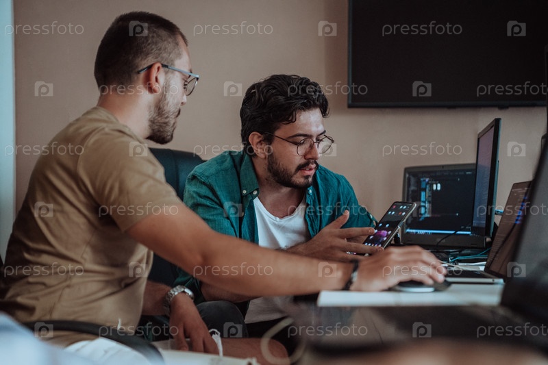Программисты, погруженные в тесное сотрудничество, усердно трудятся вместе над решением сложных проблем и разработкой инновационных мобильных приложений с безупречной функциональностью