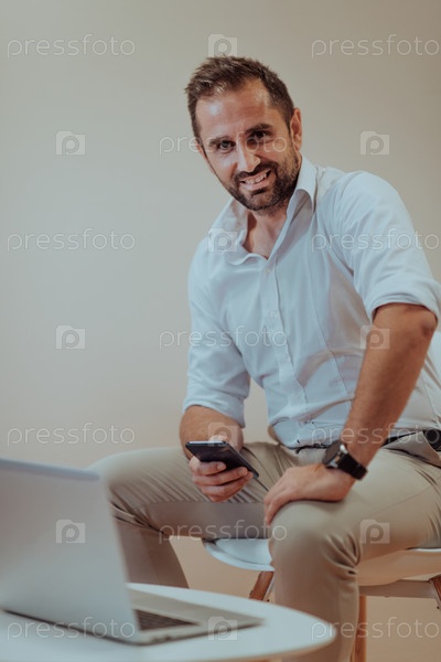 Уверенный в себе бизнесмен сидит и с решительным выражением лица пользуется ноутбуком и смартфоном, а бежевый фон усиливает профессиональную атмосферу, демонстрируя его производительность и опыт