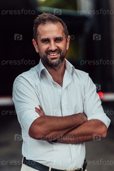 Успешный бизнесмен в белой рубашке, скрестив руки, позирует на открытом воздухе с уверенным выражением лица