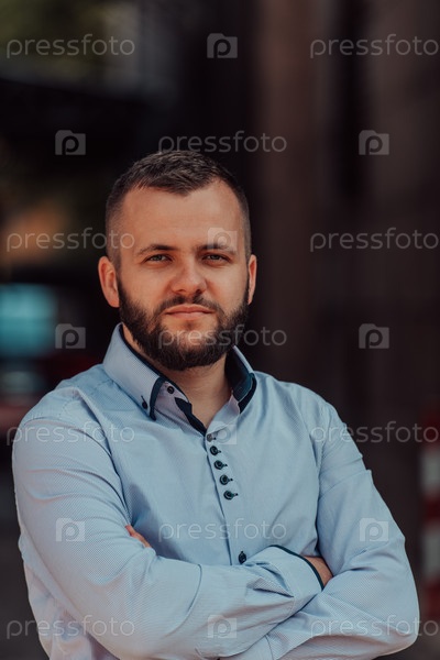 Успешный молодой бизнесмен в рубашке, скрестив руки, позирует на открытом воздухе с уверенным выражением лица