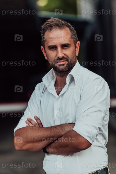 Успешный бизнесмен в белой рубашке со скрещенными руками позирует на открытом воздухе