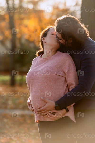 Мужчина с любовью обнимает свою беременную жену в парке, разделяя мирный момент тепла и привязанности