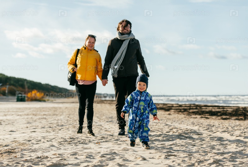 Счастливая семья прогуливается по прохладному осеннему пляжу, а их маленький сын радостно бежит впереди, создавая незабываемые воспоминания, пока свежий ветер и успокаивающие волны окутывают их в момент чистого единения