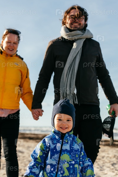 Счастливая семья прогуливается по прохладному осеннему пляжу, а их маленький сын радостно бежит впереди, создавая незабываемые воспоминания, пока свежий ветер и успокаивающие волны окутывают их в момент чистого единения