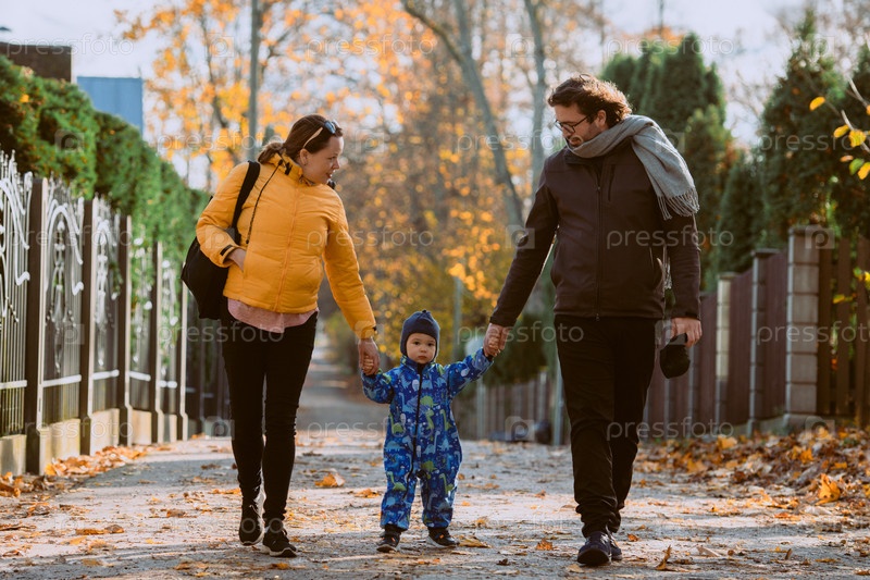 Влюбленная пара прогуливается по залитому солнцем парку со своим маленьким сыном, окруженная яркими красками осени, наслаждаясь радостными и мирными моментами совместного семейного общения