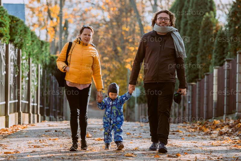 Влюбленная пара прогуливается по залитому солнцем парку со своим маленьким сыном, окруженная яркими красками осени, наслаждаясь радостными и мирными моментами совместного семейного общения