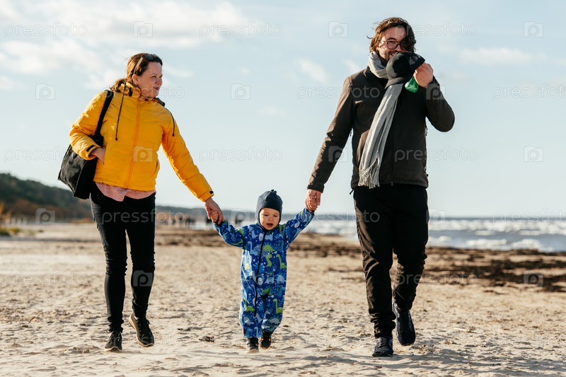 Счастливая семья прогуливается по прохладному осеннему пляжу, а их маленький сын радостно бежит впереди, создавая незабываемые воспоминания, пока свежий ветер и успокаивающие волны окутывают их в момент чистого единения