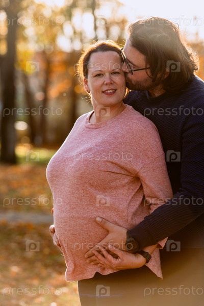 Мужчина с любовью обнимает свою беременную жену в парке, разделяя мирный момент тепла и привязанности