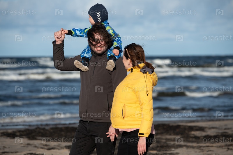 Счастливая семья прогуливается по прохладному осеннему пляжу, а их маленький сын радостно бежит впереди, создавая незабываемые воспоминания, пока свежий ветер и успокаивающие волны окутывают их в момент чистого единения