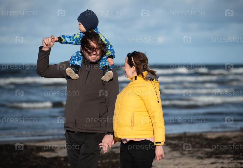 Счастливая семья прогуливается по прохладному осеннему пляжу, а их маленький сын радостно бежит впереди, создавая незабываемые воспоминания, пока свежий ветер и успокаивающие волны окутывают их в момент чистого единения
