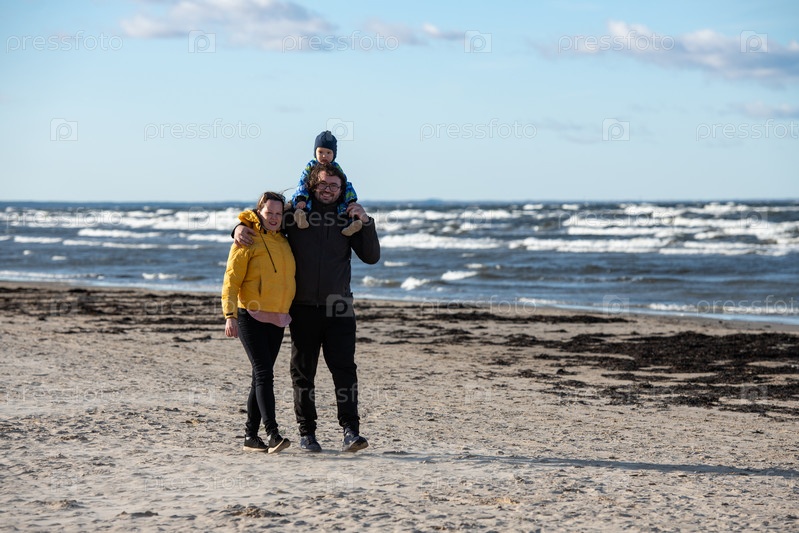 Счастливая семья прогуливается по прохладному осеннему пляжу, а их маленький сын радостно бежит впереди, создавая незабываемые воспоминания, пока свежий ветер и успокаивающие волны окутывают их в момент чистого единения