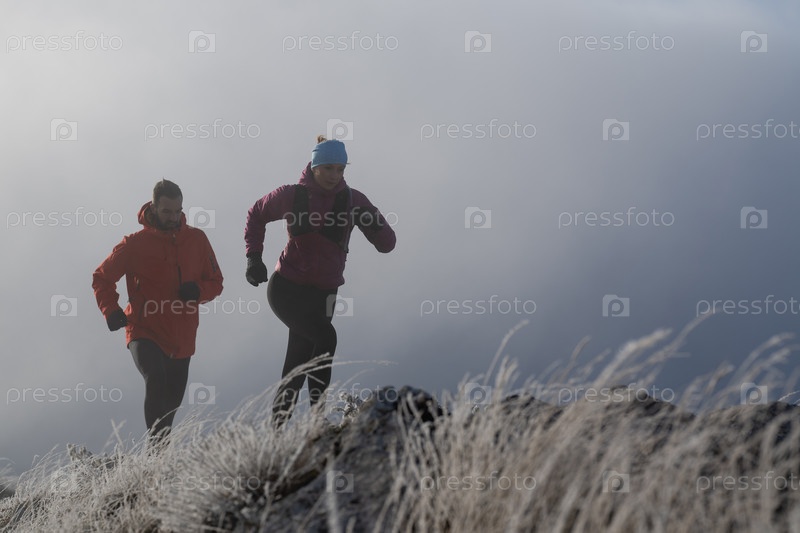 Пара, занимающаяся трейлраннингом, мужчина и женщина бегут по горной тропе