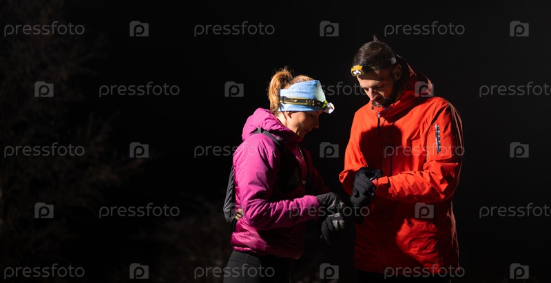 Бегуны, уставшие от дыхания после тренировки, смотрят на свои спортивные смарт-часы ночью на поддержание